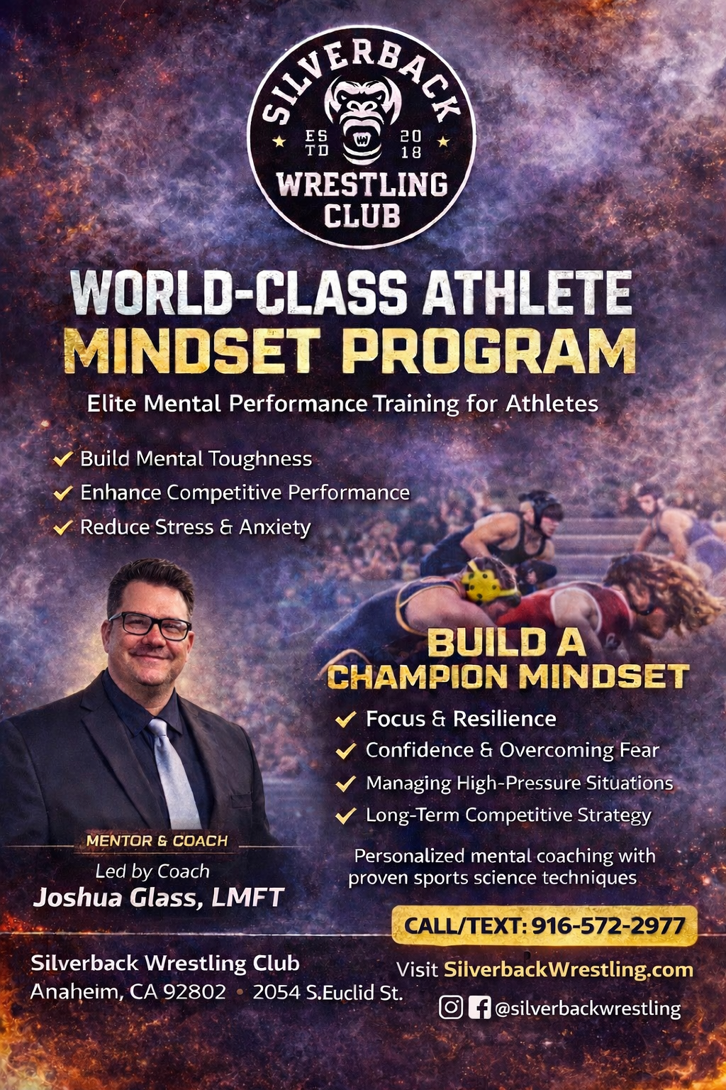 Silverback Wrestling Club is designed to help wrestlers of all ages, both boys and girls, improve their overall wrestling skills. We have youth from all over Southern California that attend our training sessions and compete with our team. Our intimate setting assures that each wrestler will get hands-on attention. Wrestlers will learn high-percentage techniques from the feet, take-down to finish. Techniques covered from the bottom position include stand-ups, leg ride defense, spiral ride, and ankle ride counters as well as reversals. Each wrestler will also learn ways to score from the top position, including leg riding, armbar series, tilts, and cradles. Our club teaches wrestlers about healthy weight management, mindset, sportsmanship, team building, leadership, and discipline. We help high school students with college recruiting and scholarships so that they can use wrestling to ensure they receive a good education and future career.